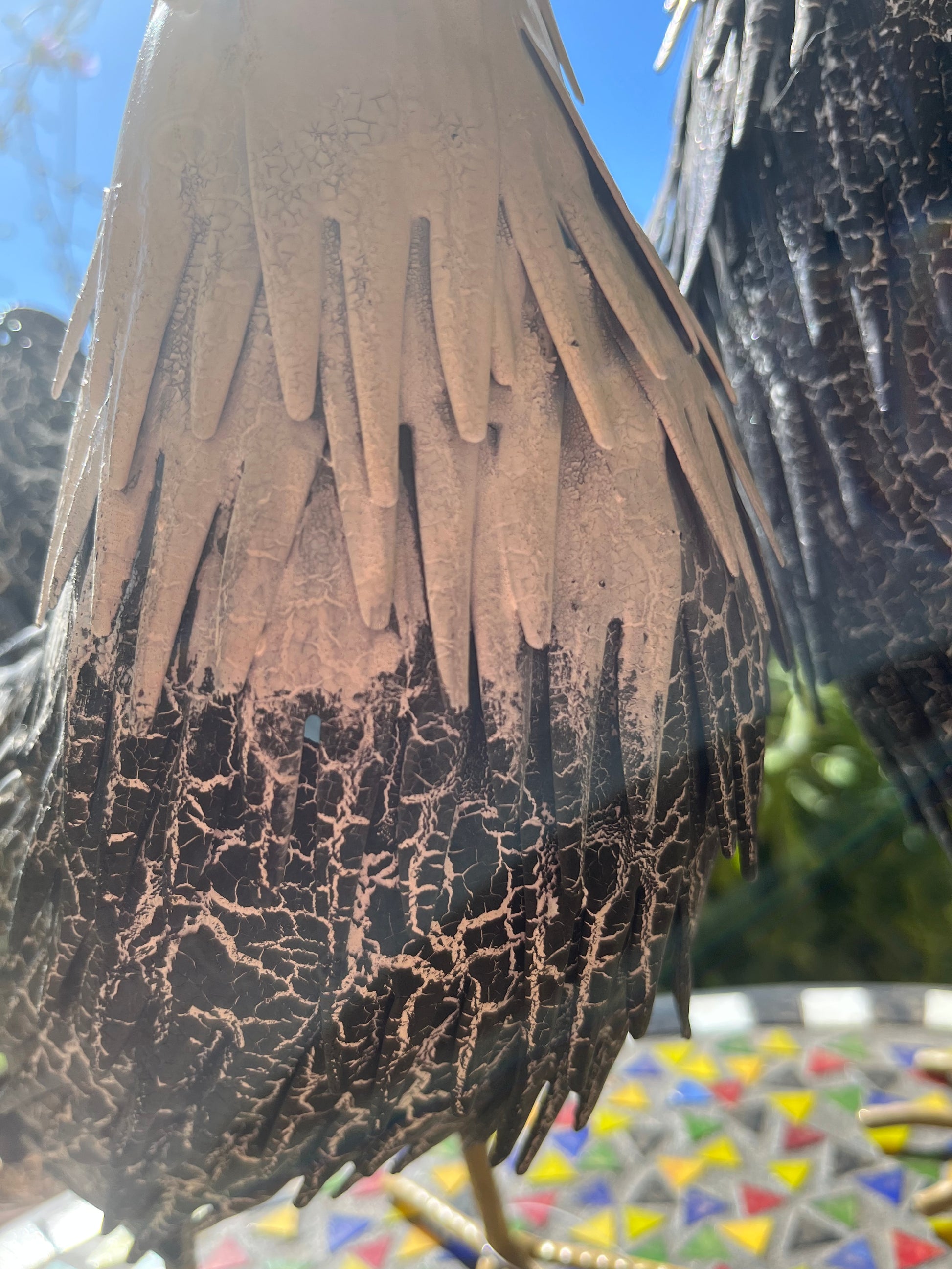 Add charm to your garden with this delightful set of two hand-painted mild steel ornaments featuring a chicken and a rooster. Measuring 15.5 x 32 x 46 cm and 12.5 x 25 x 32 cm, each piece showcases unique craftsmanship with UV-resistant paint to help maintain its vibrant look. For lasting beauty, place them away from direct sunlight. Perfect for adding a rustic touch and character, these ornaments bring life and personality to any outdoor space. Embrace the artistry of hand-painted detail—each set is one of a kind.
