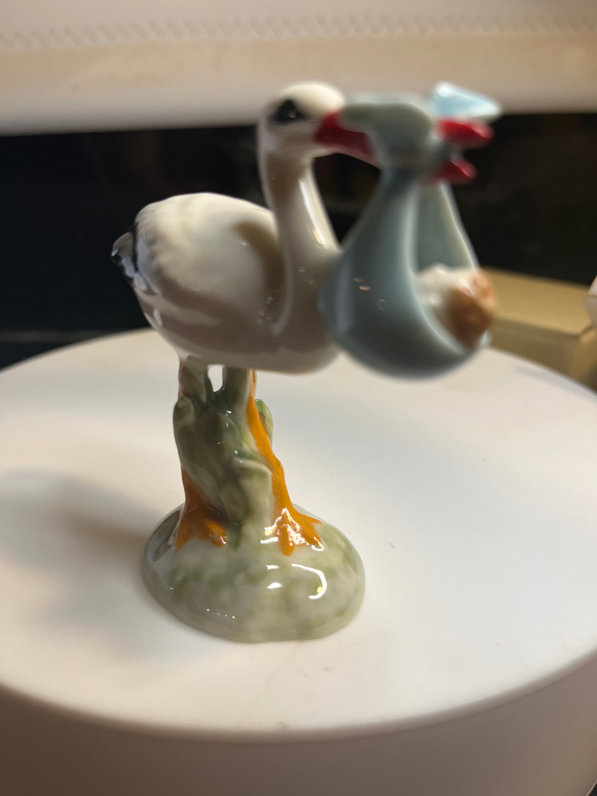 Miniature Hand Painted Porcelain Stork With Baby Boy