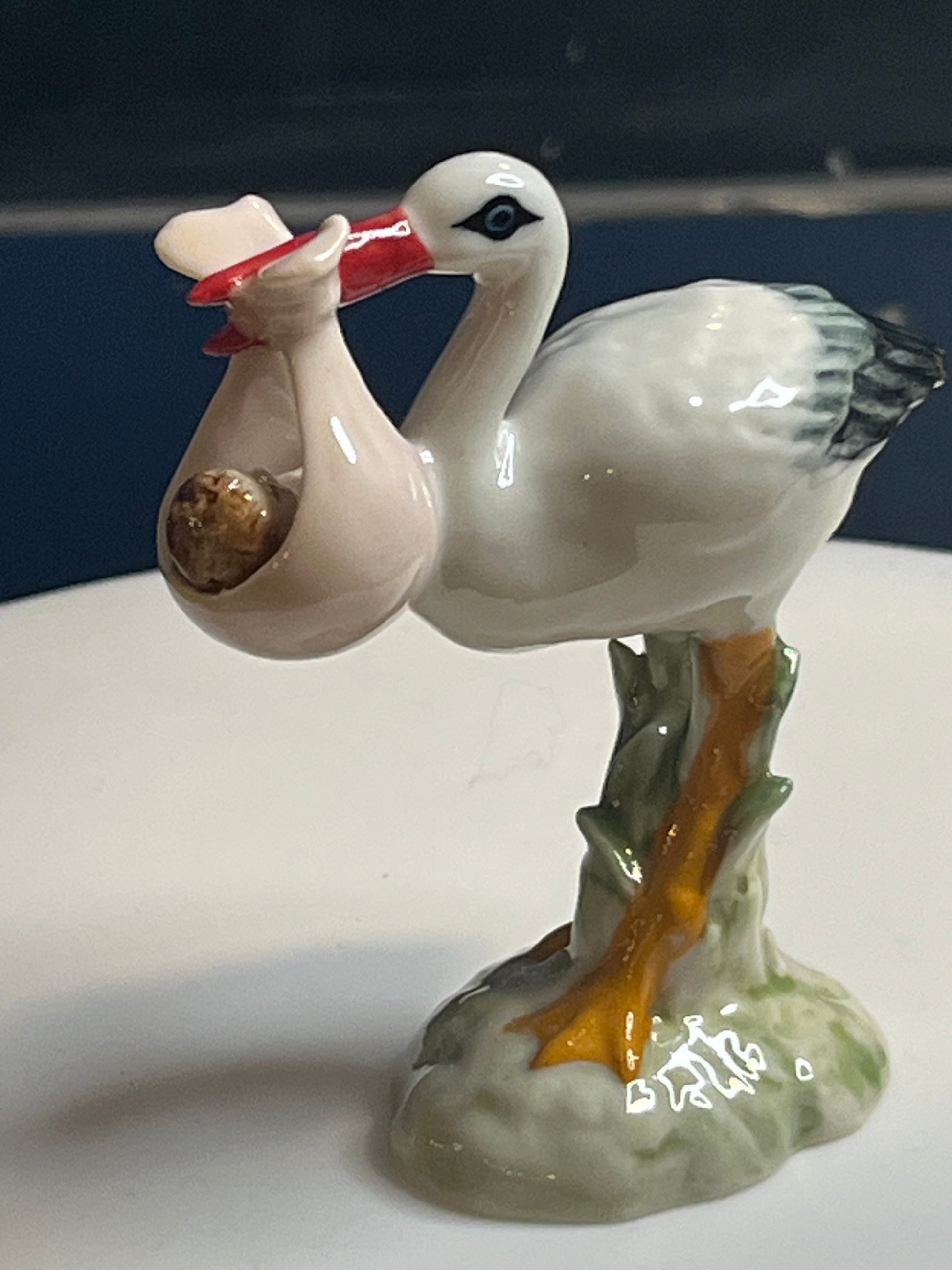 Miniature Hand Painted Porcelain Stork With Baby Girl