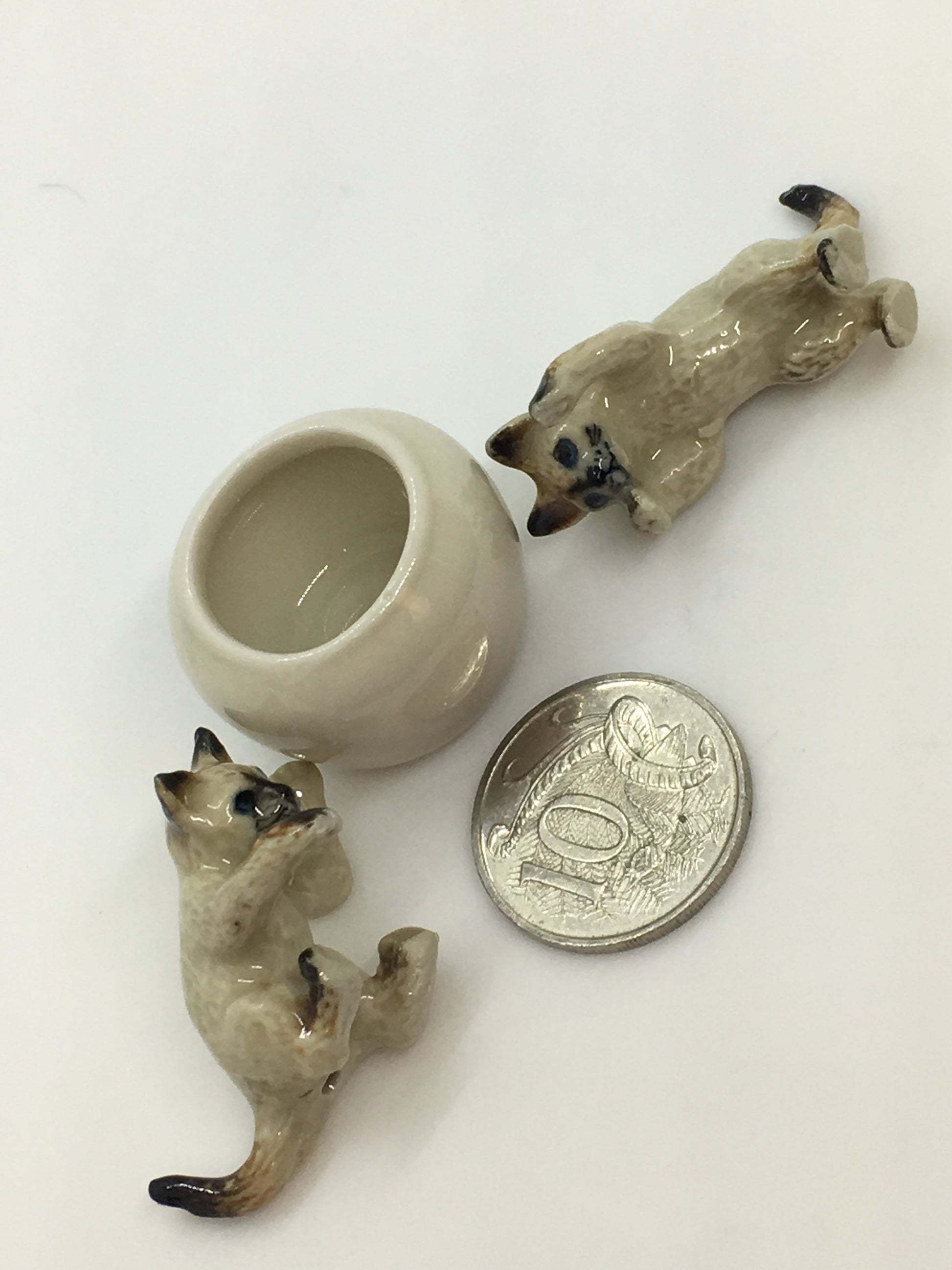 Take a look at our huge range of hand painted porcelain cat figurines. High quality miniatures with attention to detail. We literally stock hundreds of animal miniatures so take a look at our other miniature animals. The miniature Siamese Cats measure approximately 3cm long and 4cm high, the jar measures approximately 3 cm in diameter. (3pcs)
