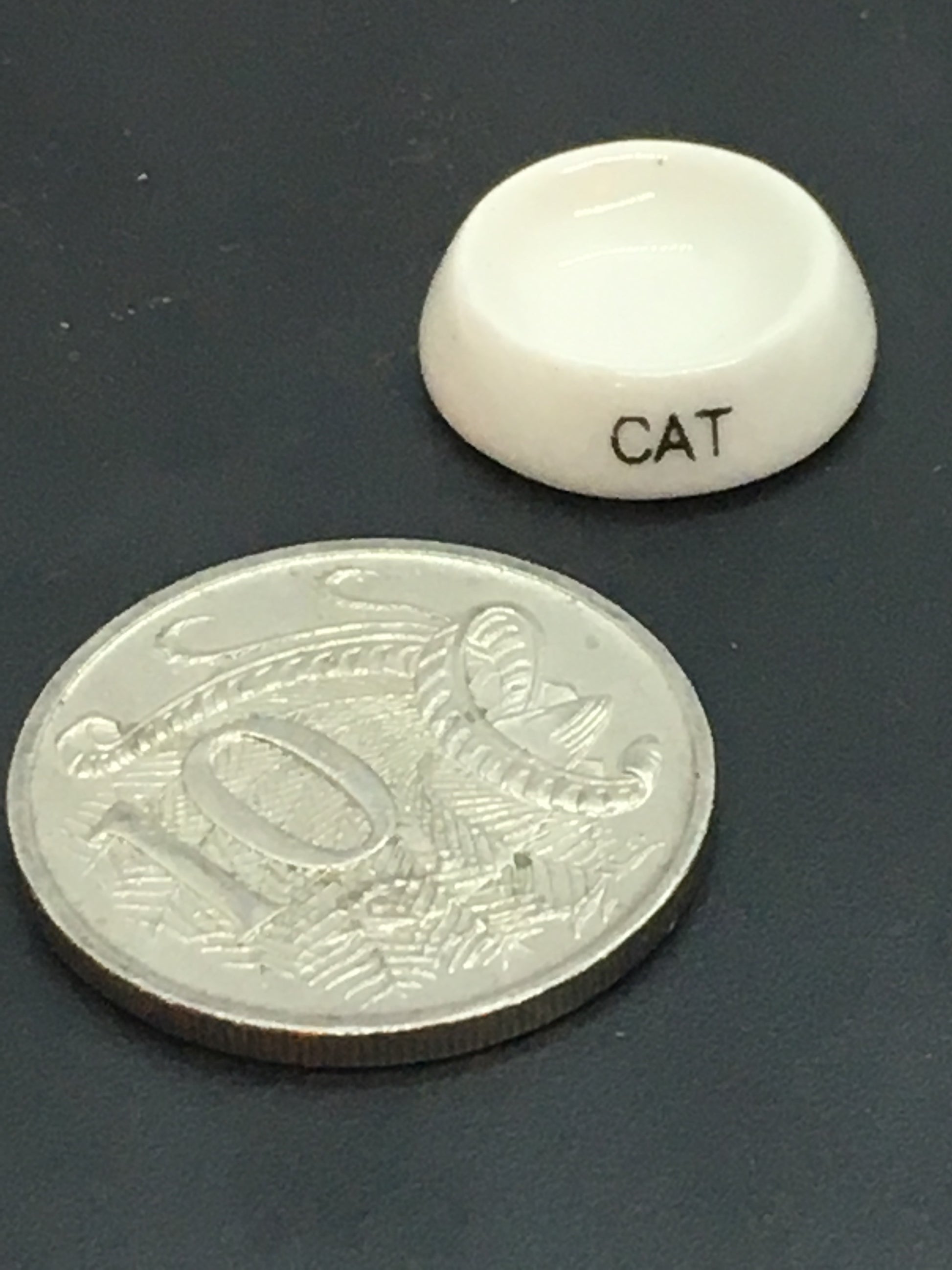 Take a look at our huge range of hand painted porcelain cat figurines. High quality miniatures with attention to detail. We literally stock hundreds of animal miniatures so take a look at our other miniature animals. The porcelain cat food bowl measures approximately 2cm in diameter and .5 long.