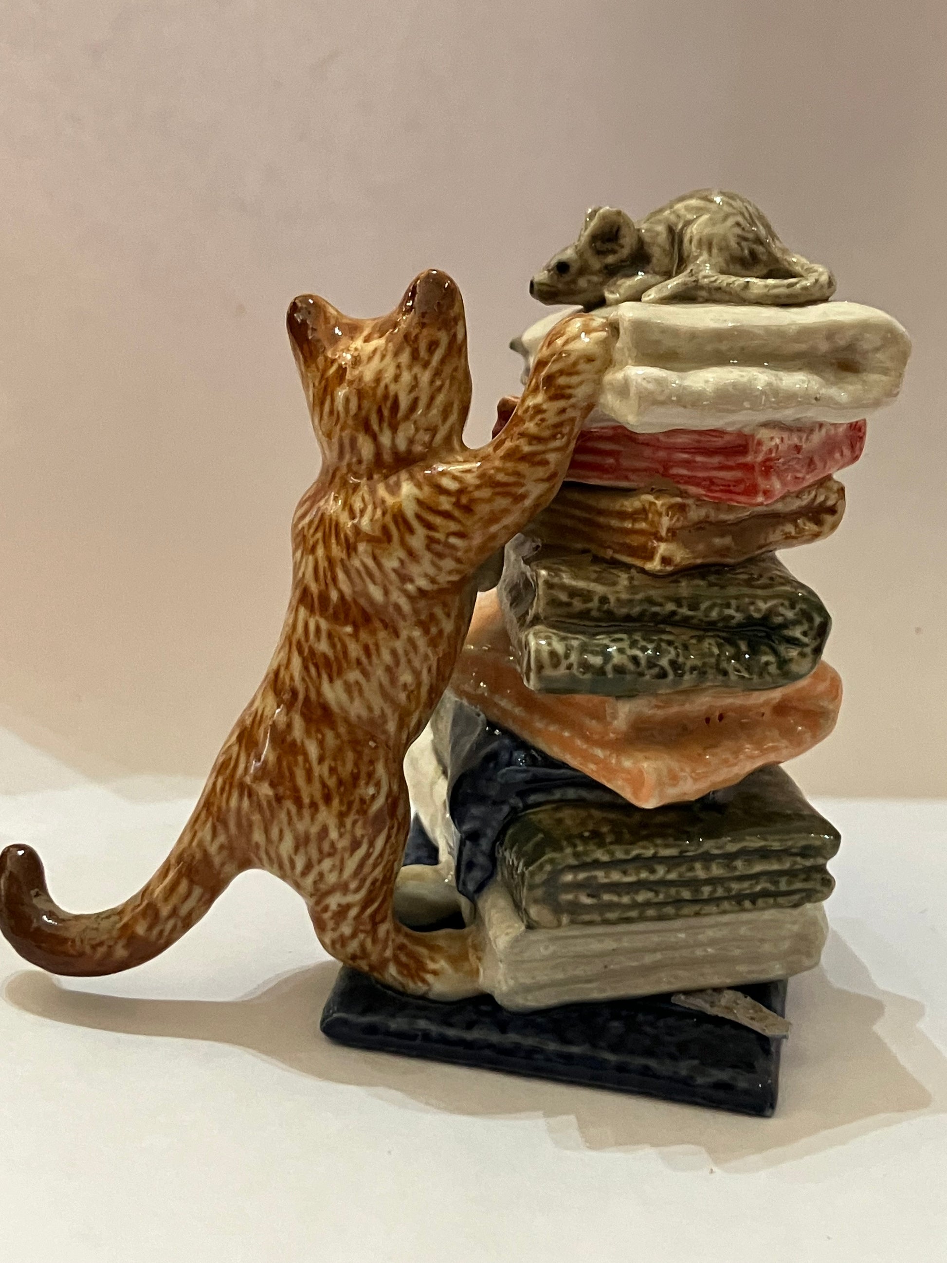 Miniature Porcelain Ginger Cat Chasing Mouse On Towels