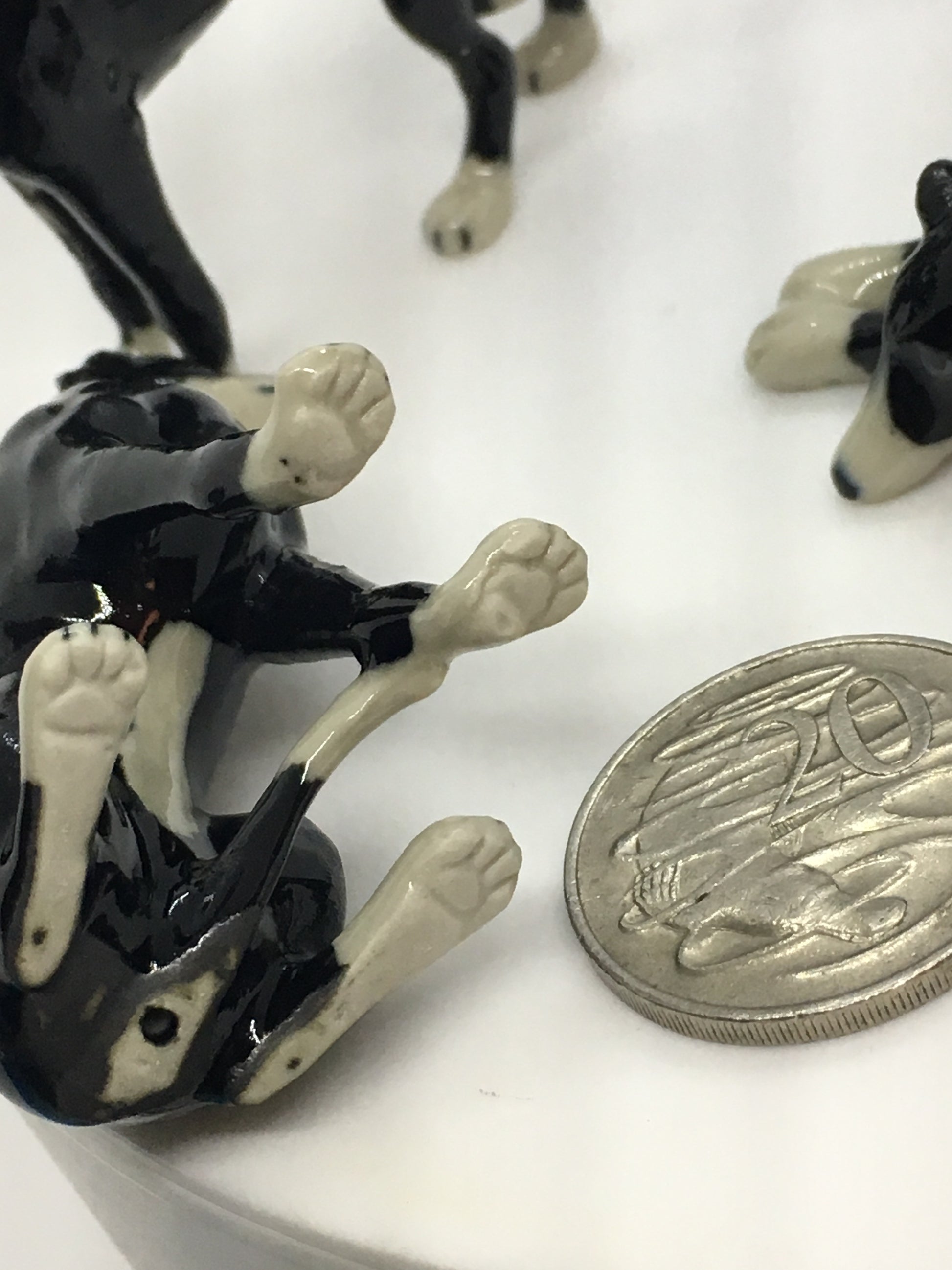Miniature porcelain hand painted Black And White Greyhound Family Dog. Set of four miniatures.