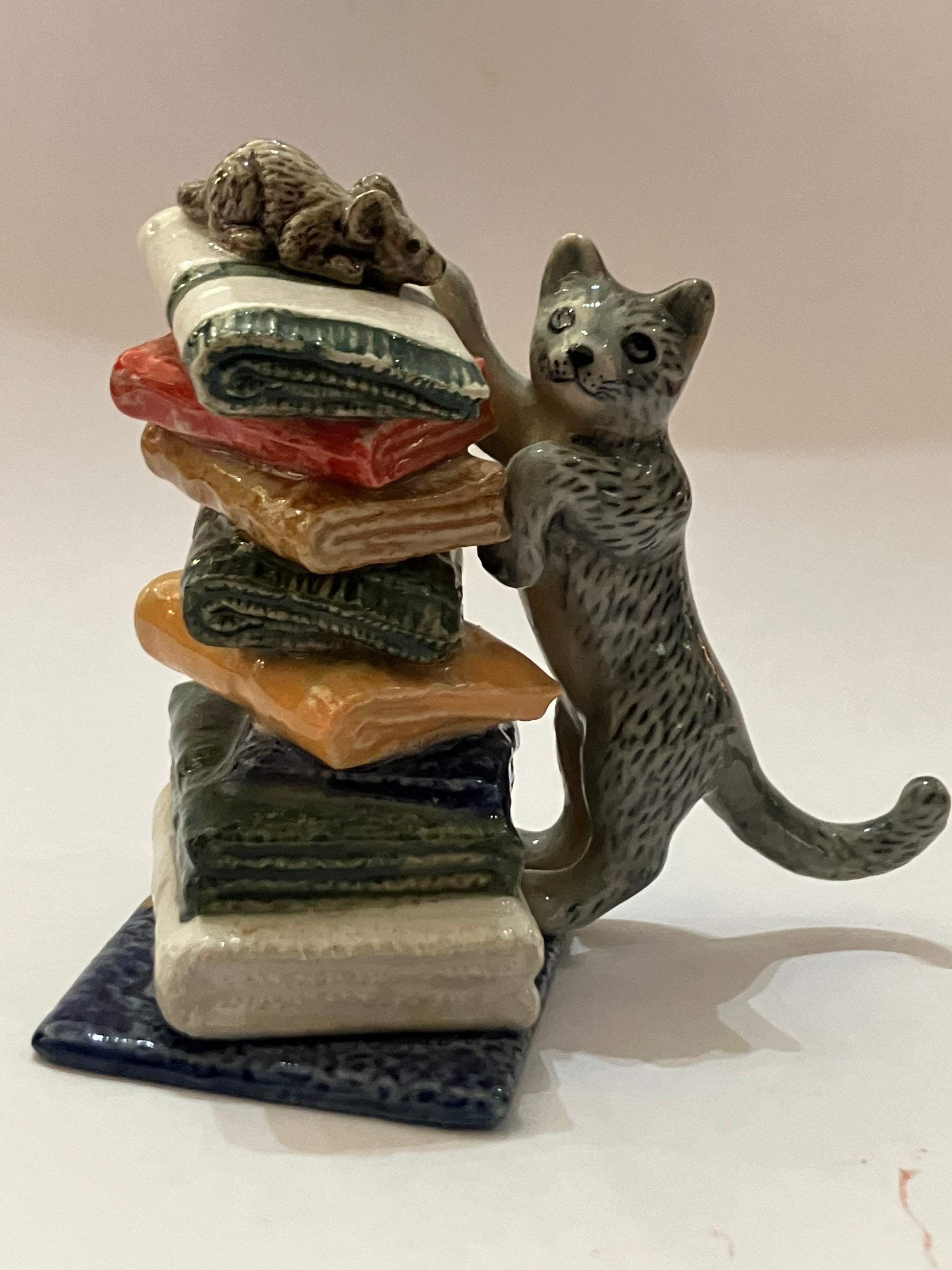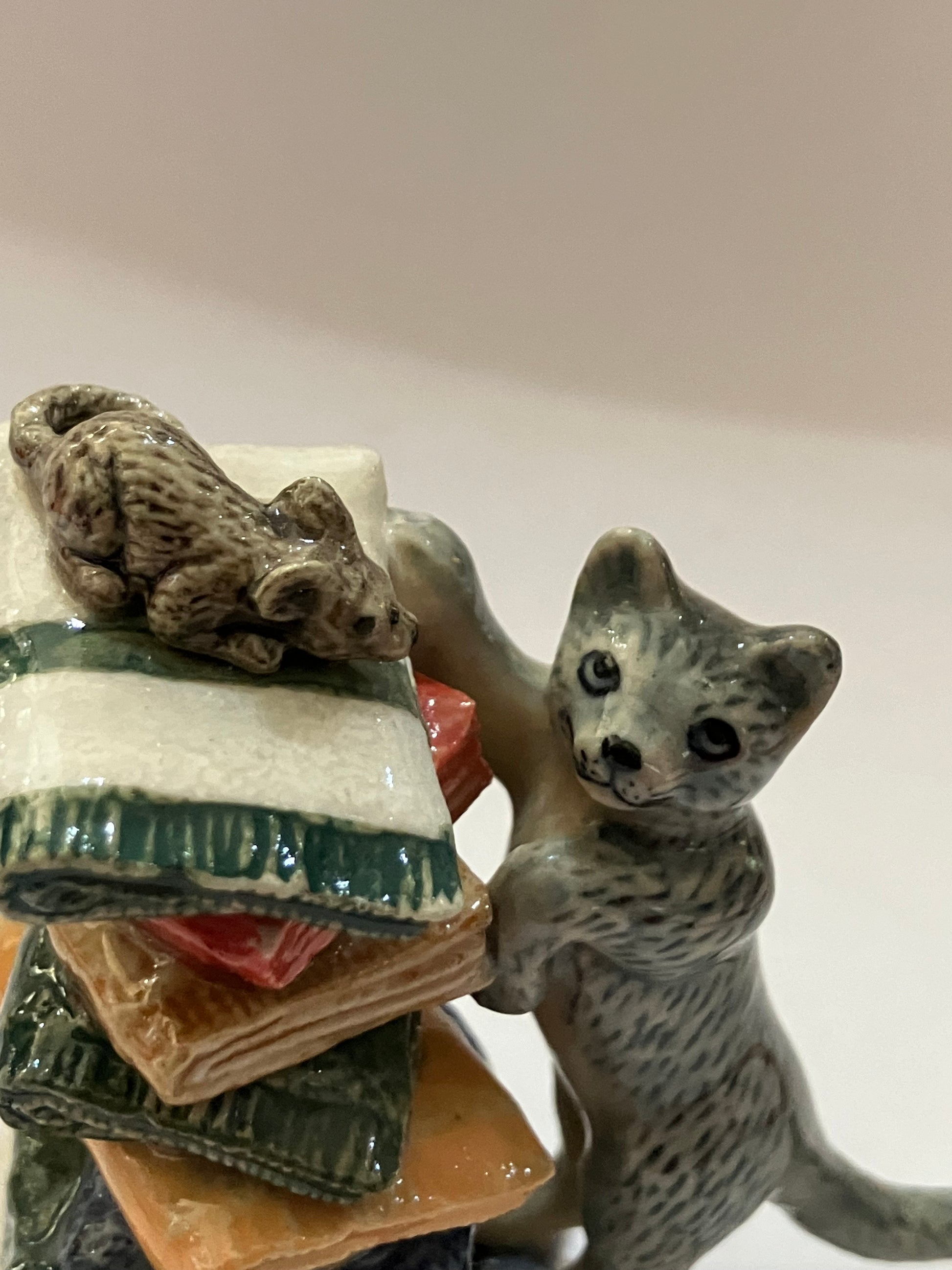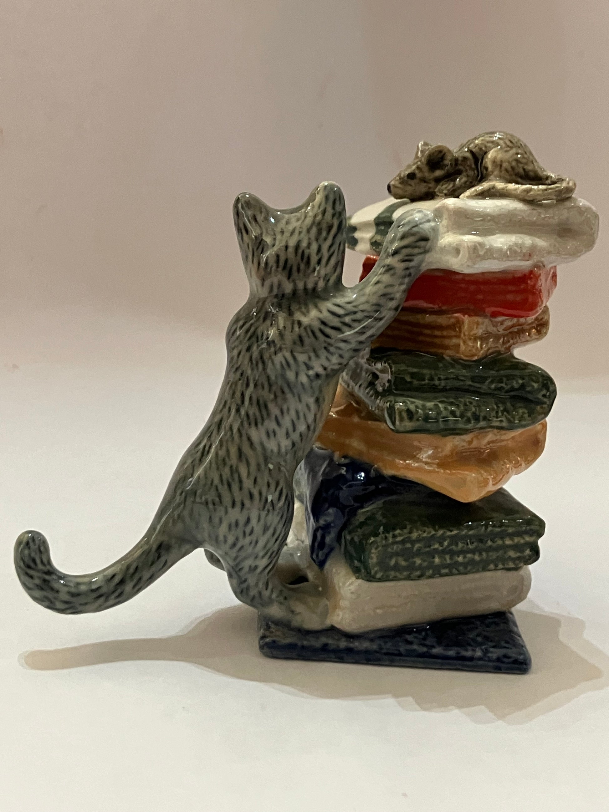 Miniature Porcelain Grey Cat Chasing Mouse On Towels