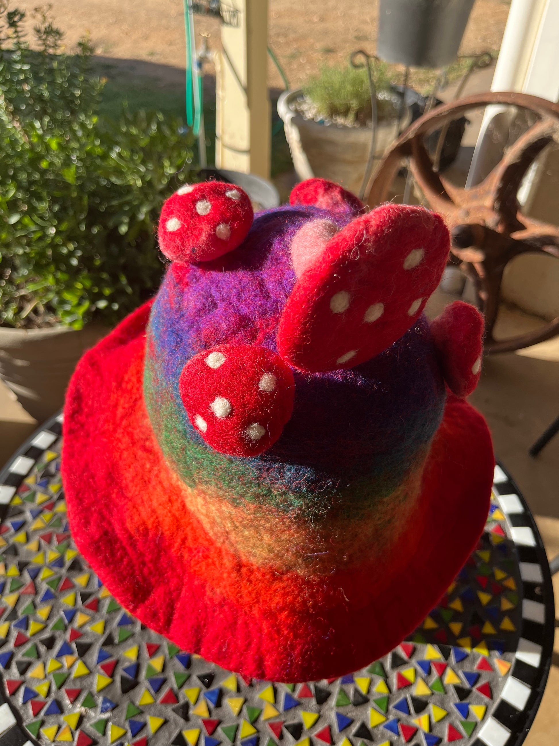 Embrace your daring side with our Rainbow Mushroom Felted Hat. Crafted from unique felt and measuring 30 cm in height this whimsical creation features a 20cm inner diameter and 30cm full width. Let your imagination take flight with this fairy-inspired accessory.