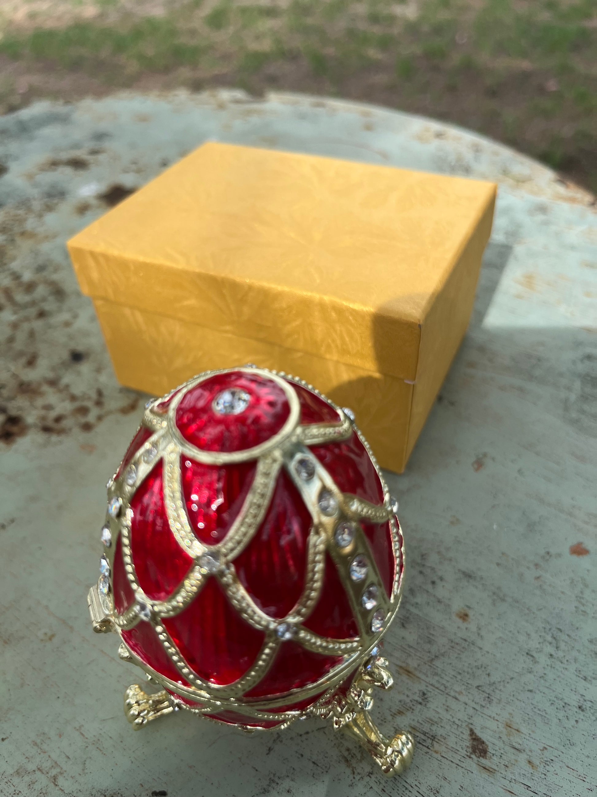 The trinket box has been skilfully crafted and hand painted with fine enamel. Embellished with crystals by hand. The Embellished Red Egg trinket box has a hinged opening and a secure magnetic closure. The Egg measures 10m high, and 7cm wide. They are great for storing small mementos, jewellery or nic nacs. The egg trinket box would make a lovely display for your home or as a special gift to that special someone knowing that they will love it. Comes in a lovely gold coloured display box.