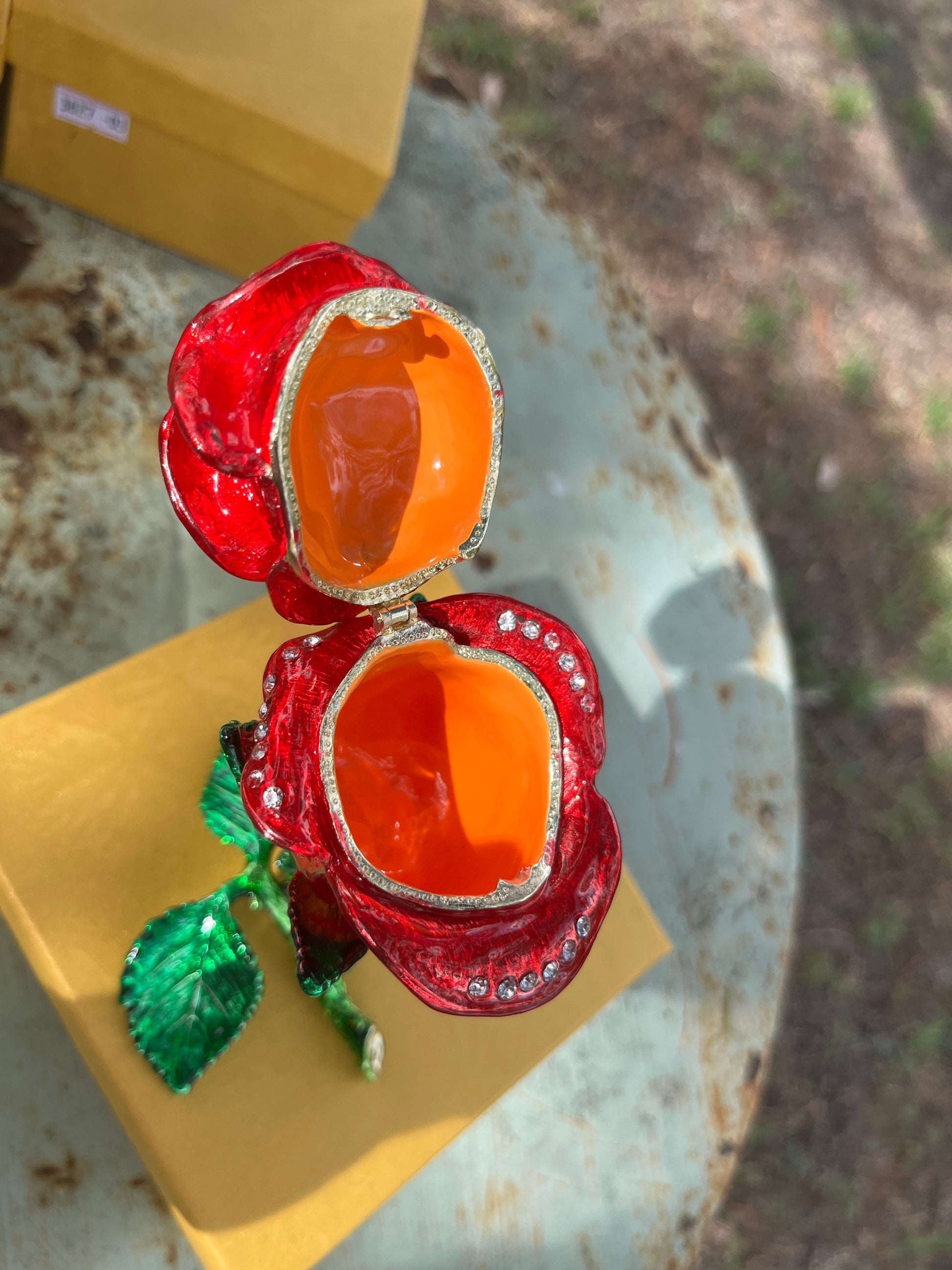 The trinket box has been skilfully crafted and hand painted with fine enamel. Embellished with crystals by hand. The Embellished Rose trinket box has a hinged opening and a secure magnetic closure. They are great for storing small mementos, jewellery or nic nacs. The Rose trinket box would make a lovely display for your home or as a special gift to that special someone knowing that they will love it. Comes in a lovely gold coloured display box.